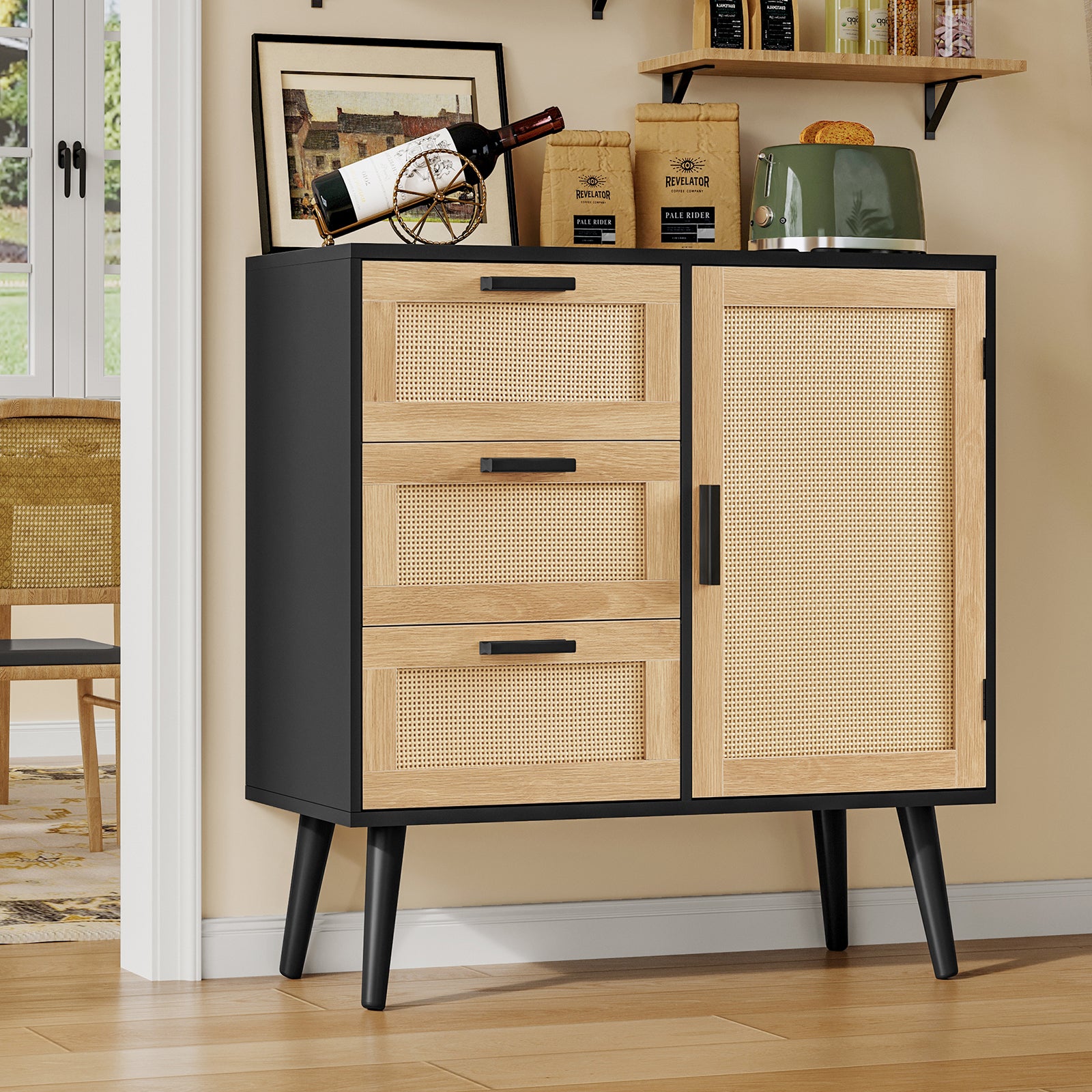 Iwell Storage Cabinet with Rattan Door & 3 Drawers, Rattan Cabinet with Adjustable Shelf, Sideboard Buffet Cabinets with Storage, Entryway Cabinets, for Living Room, Dining Room, Entryway, Black